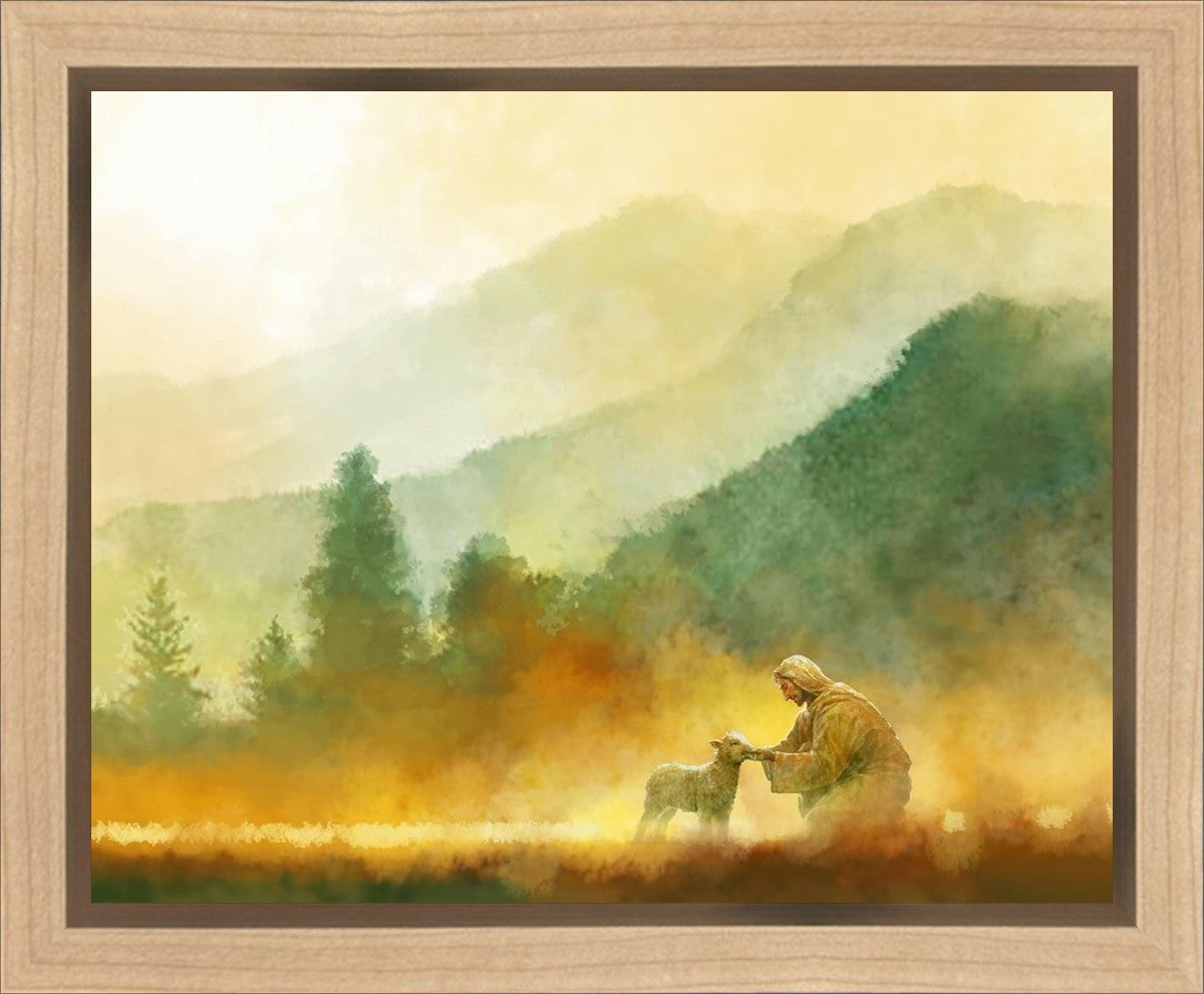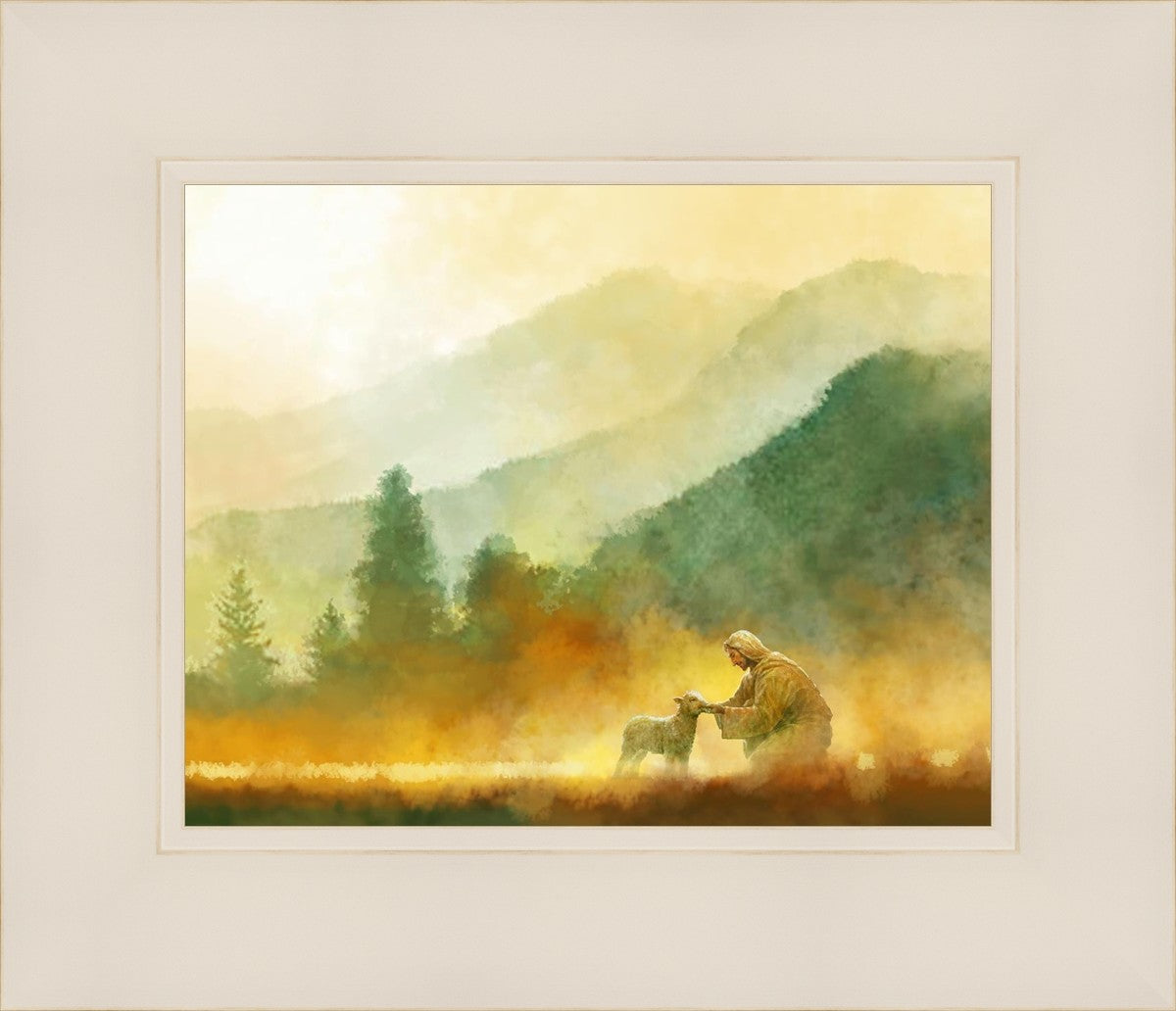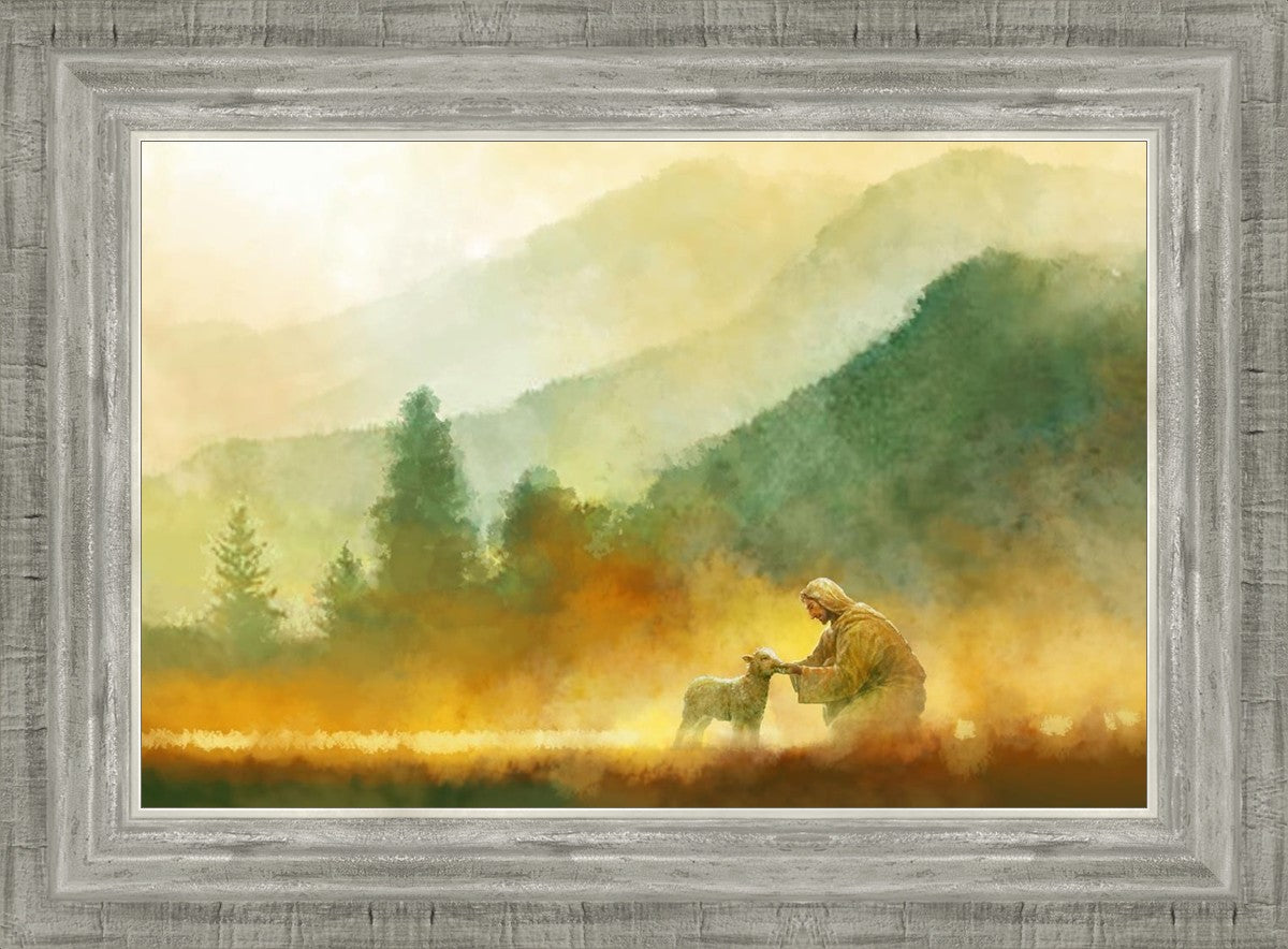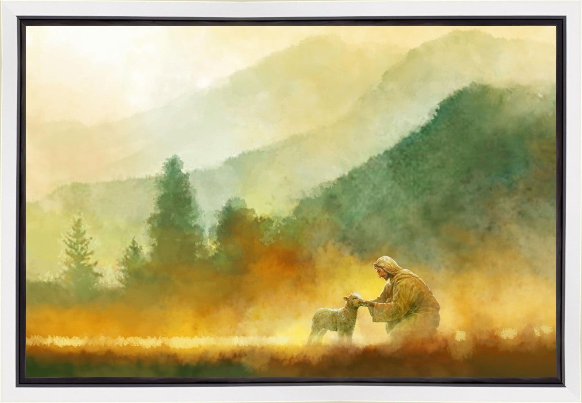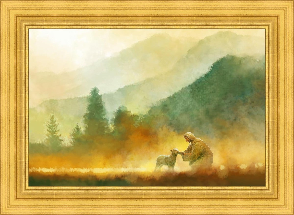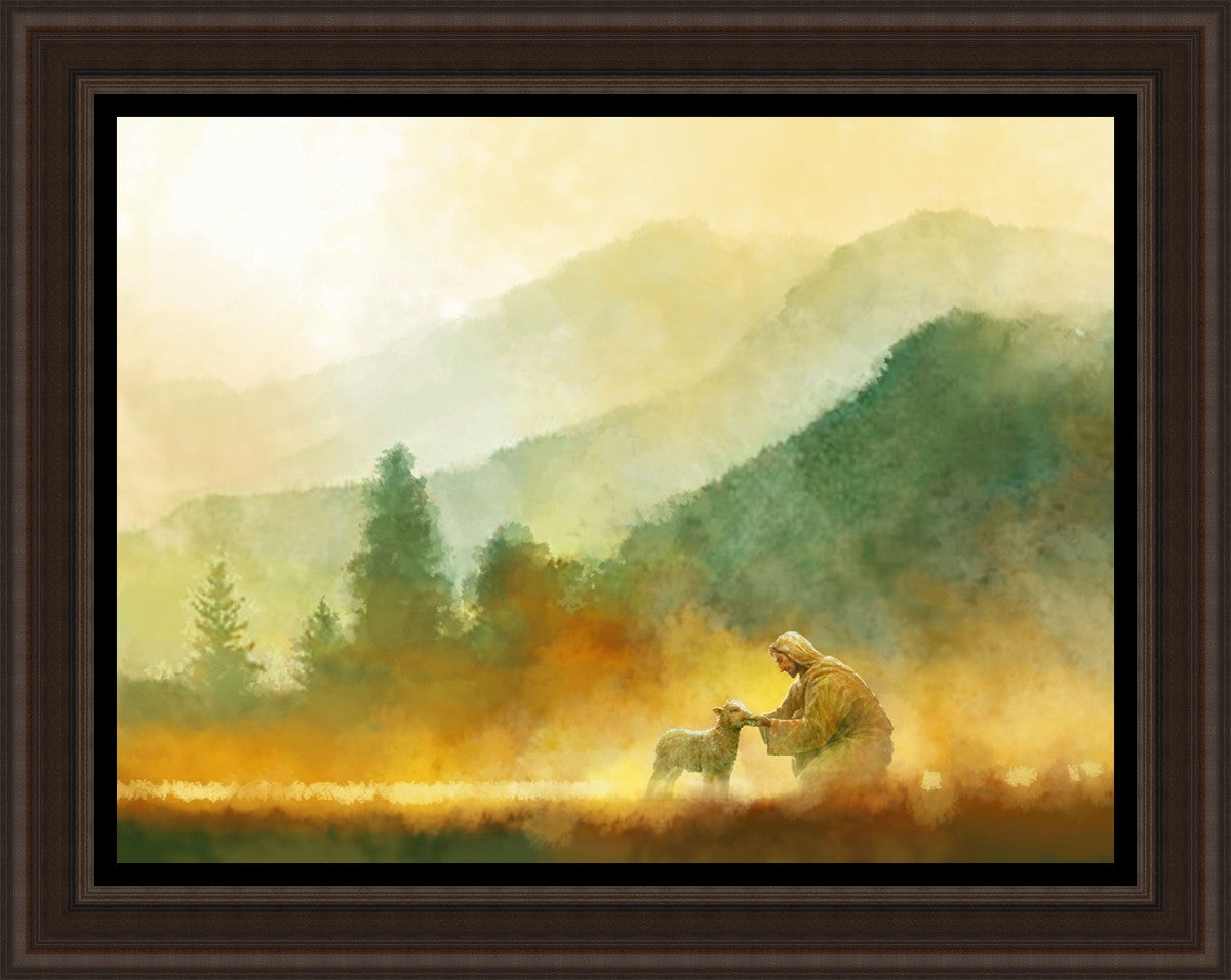 "The Lost Sheep" by Yongsung Kim depicts Jesus kneeling beside a lamb against a serene mountain landscape, symbolizing divine compassion and redemption.