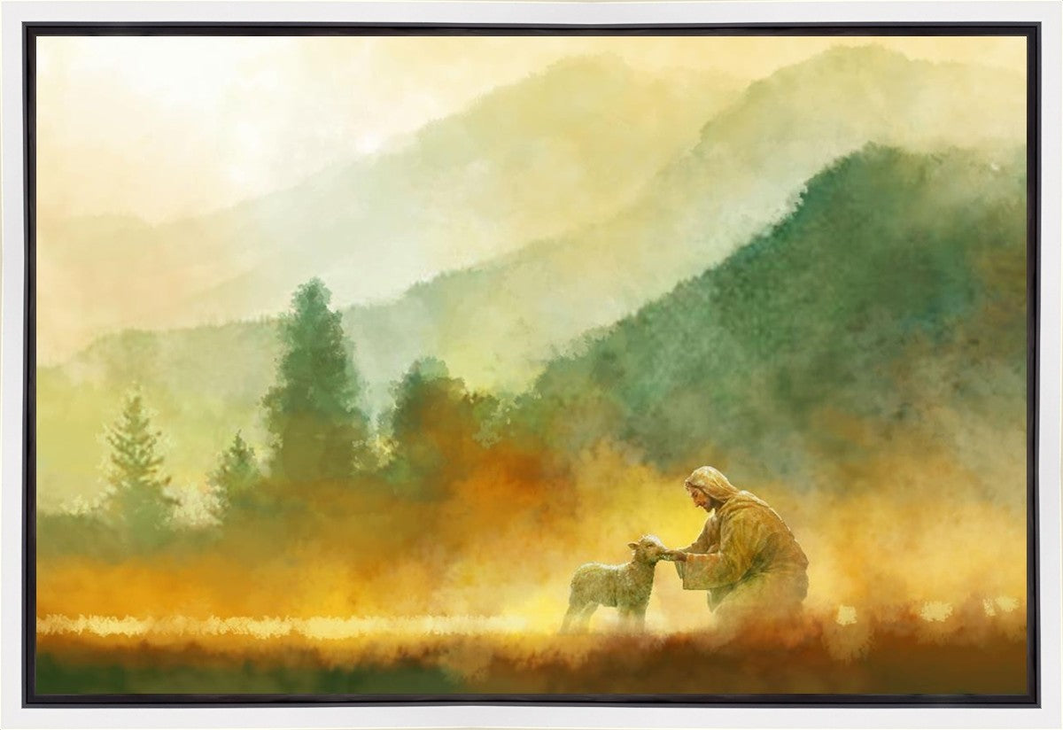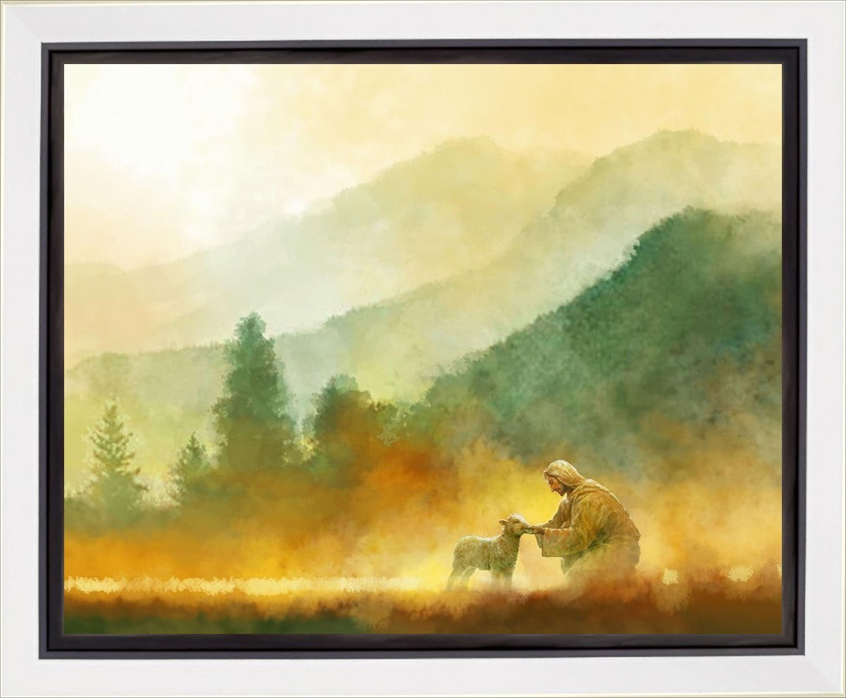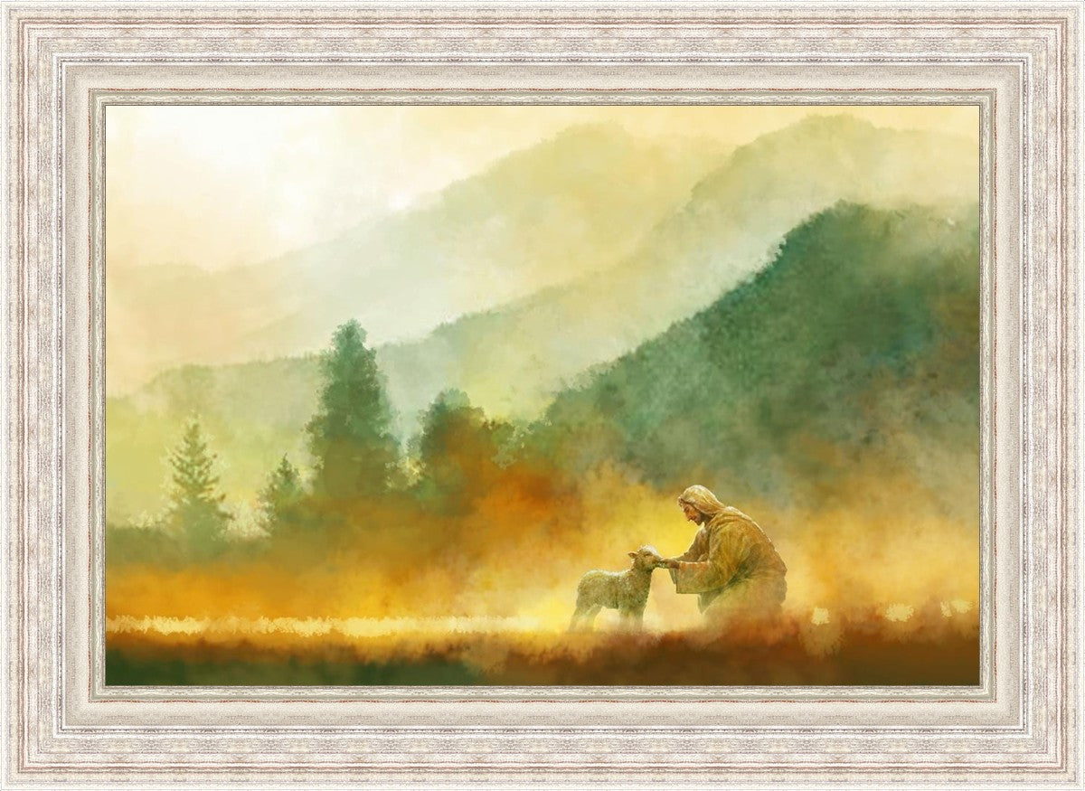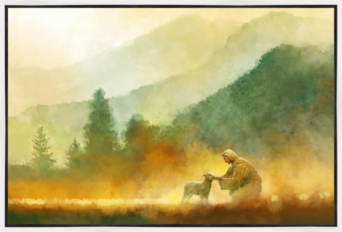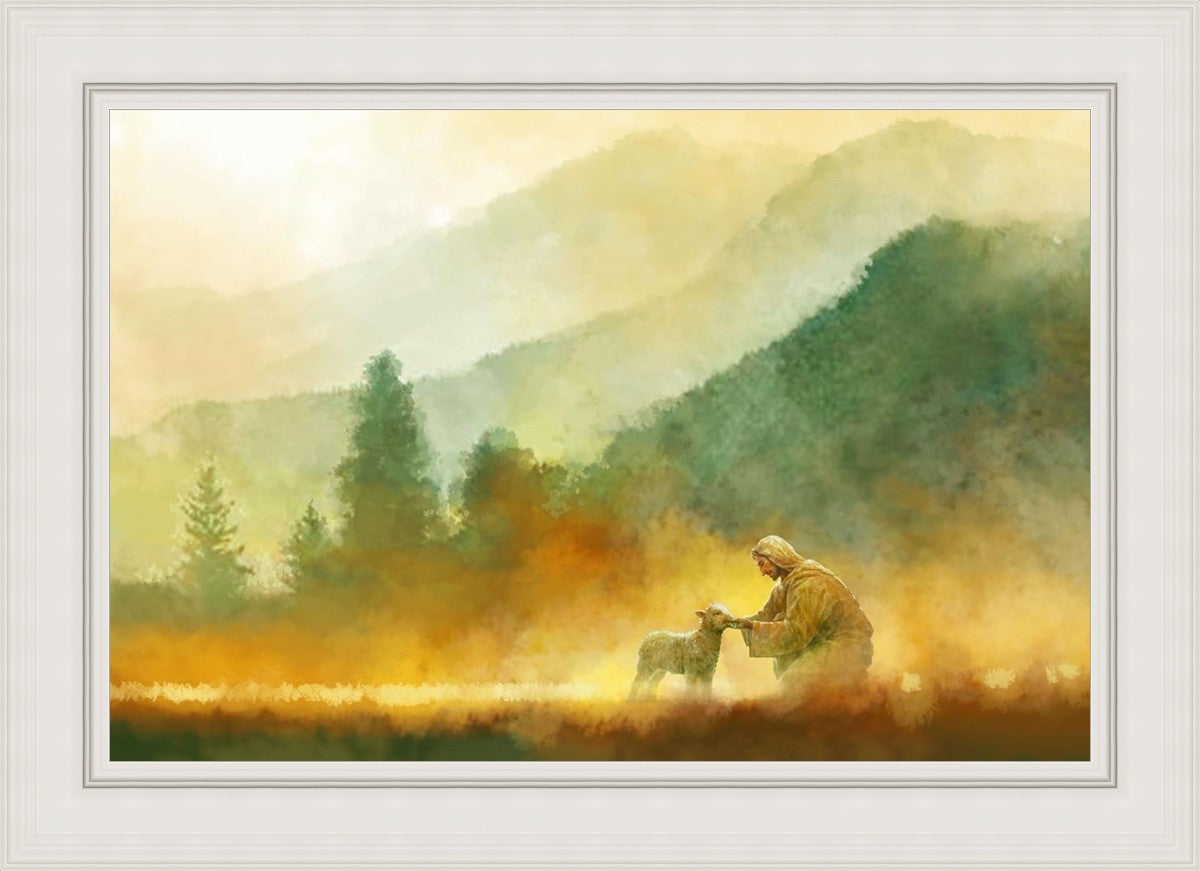 "The Lost Sheep" by Yongsung Kim depicts Jesus kneeling beside a lamb against a serene mountain landscape, symbolizing divine compassion and redemption.