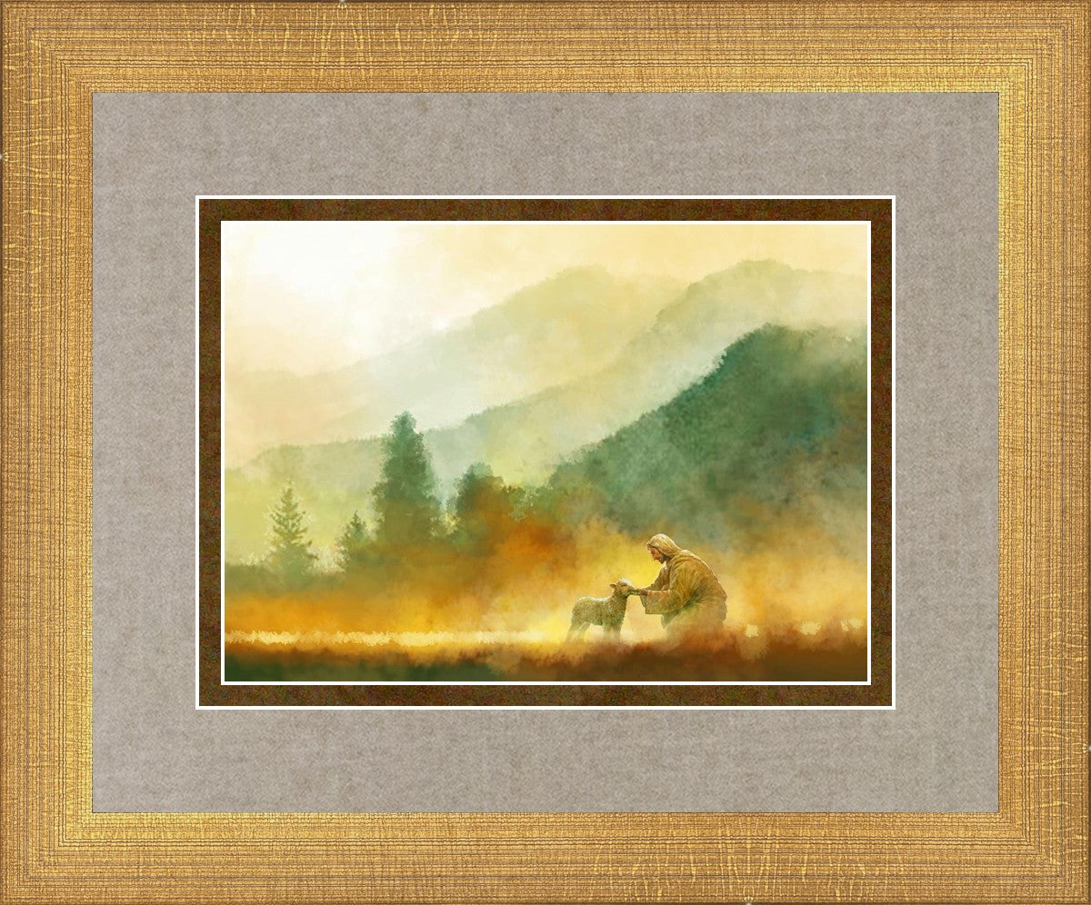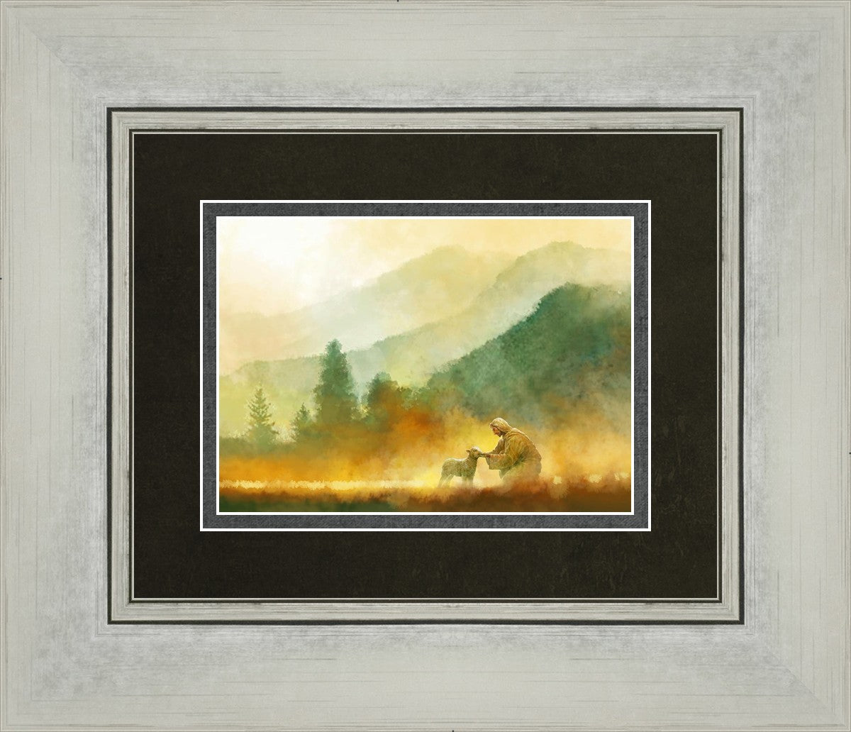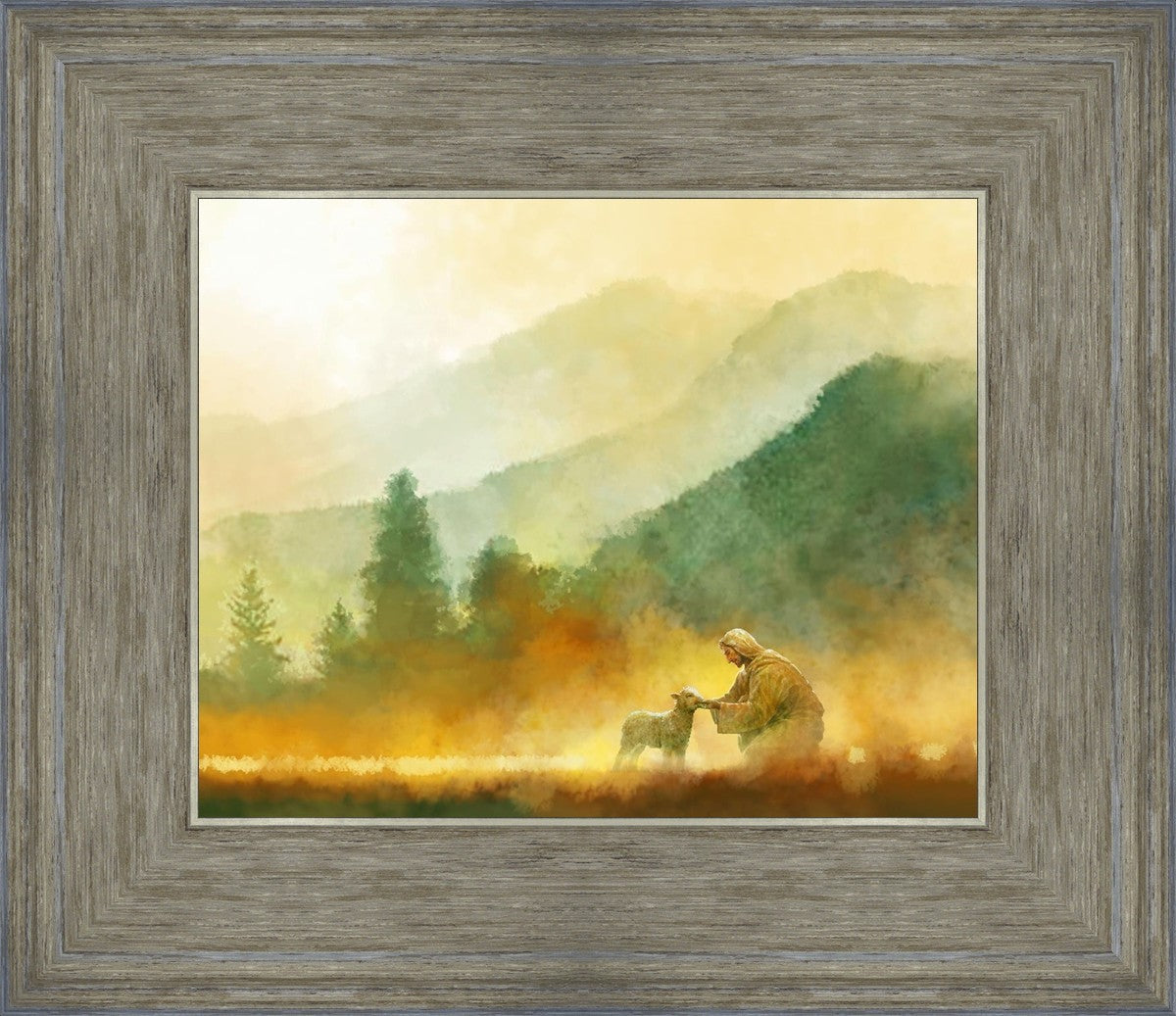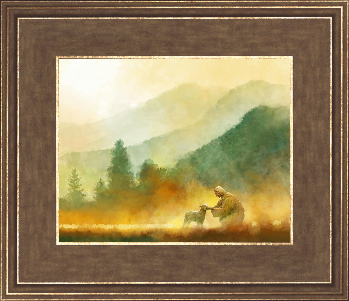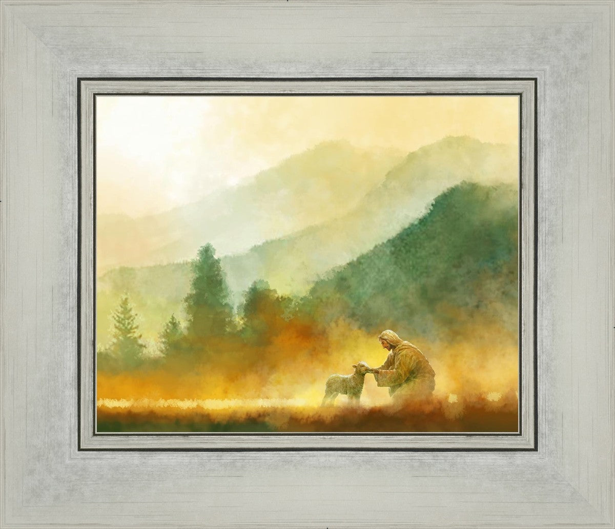 "The Lost Sheep" by Yongsung Kim depicts Jesus kneeling beside a lamb against a serene mountain landscape, symbolizing divine compassion and redemption.