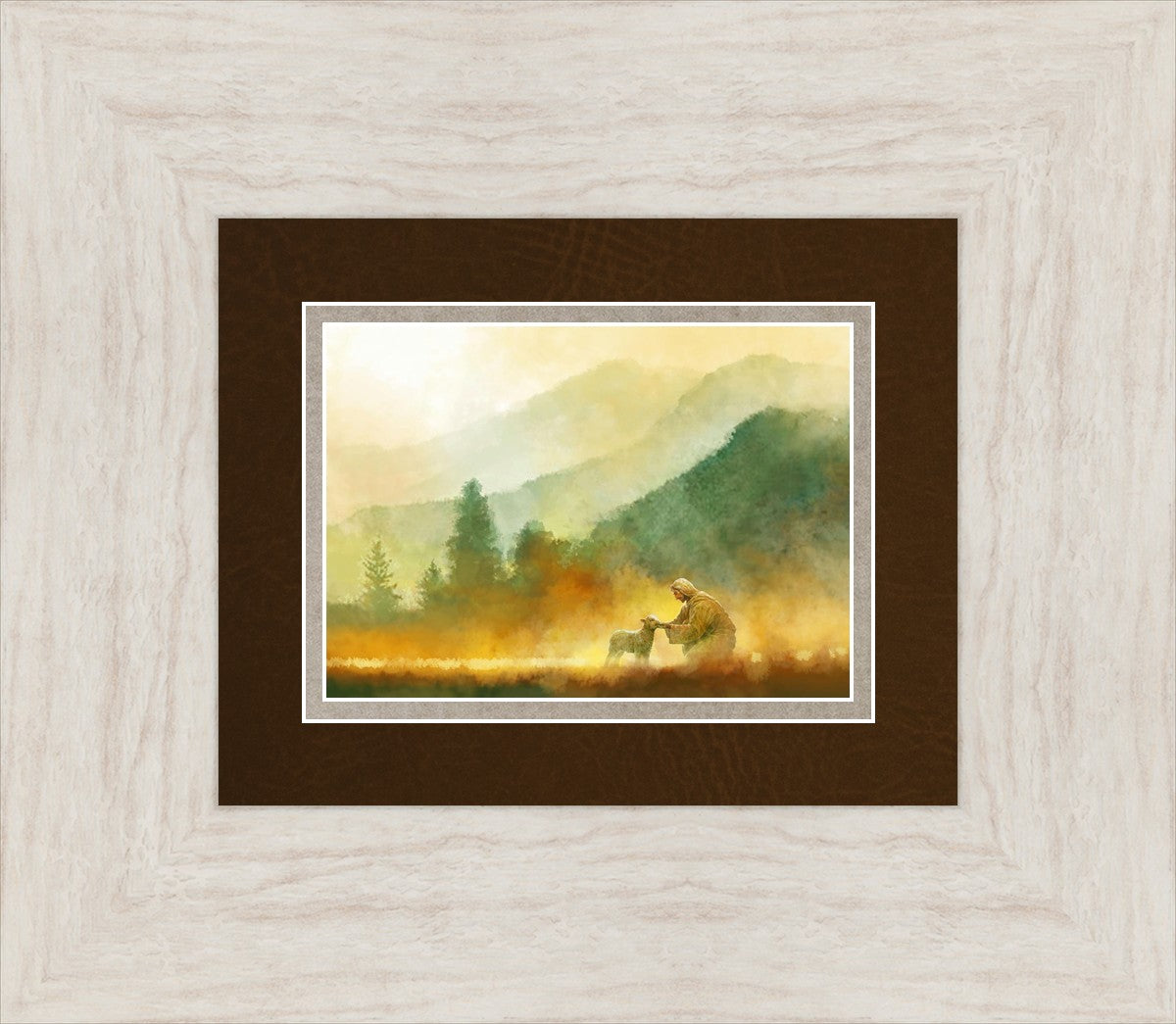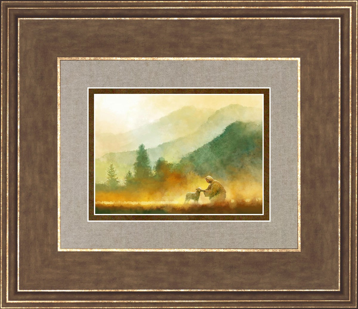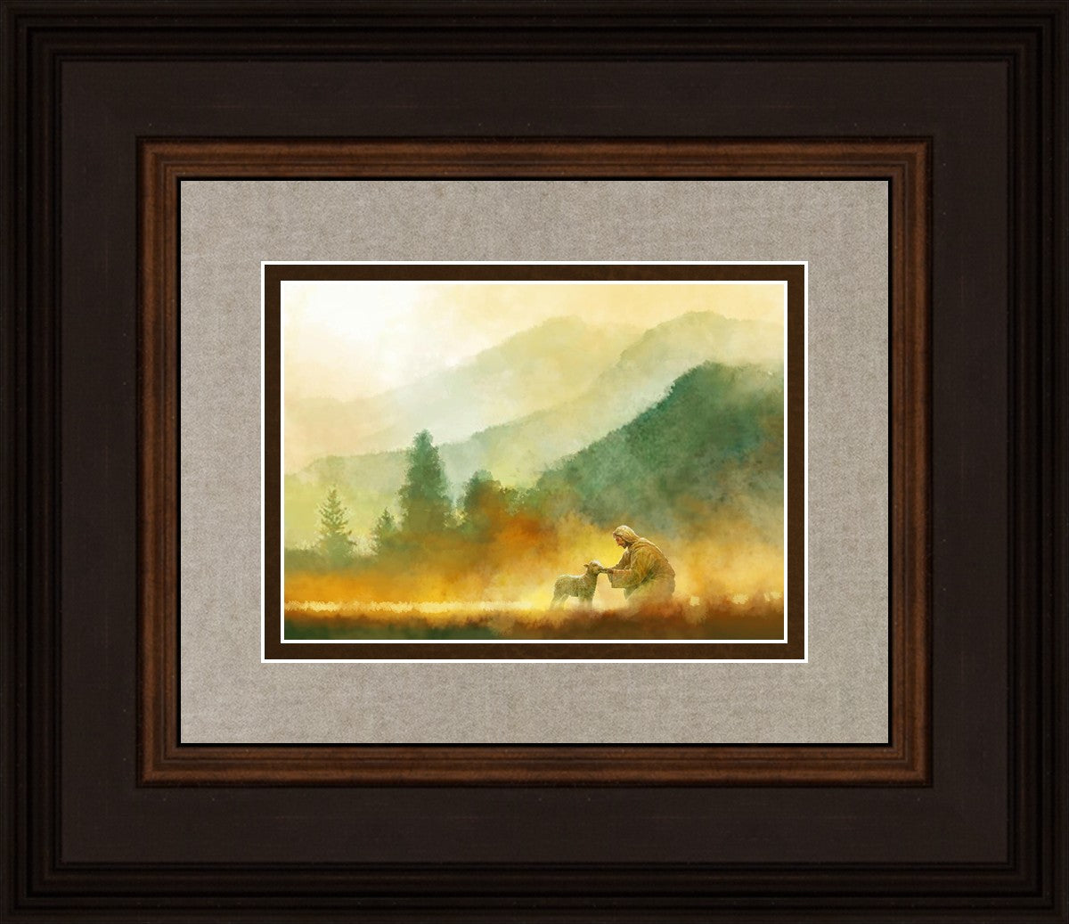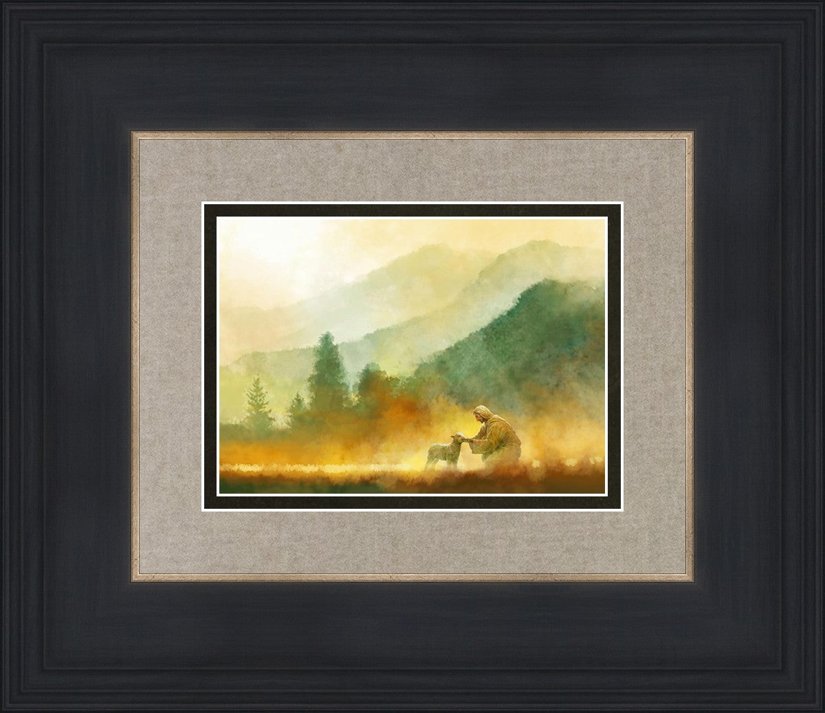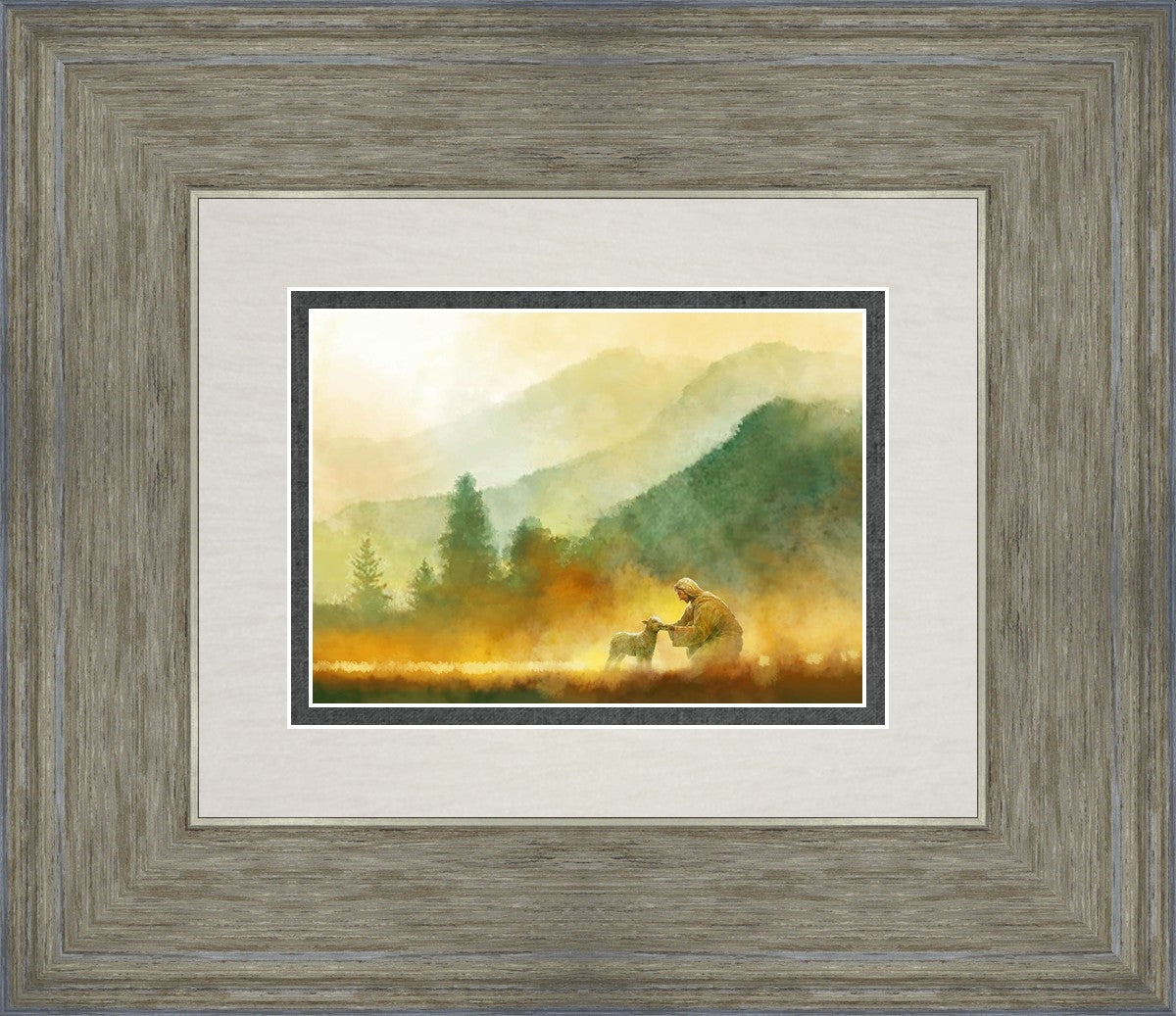"The Lost Sheep" by Yongsung Kim depicts Jesus kneeling beside a lamb against a serene mountain landscape, symbolizing divine compassion and redemption.