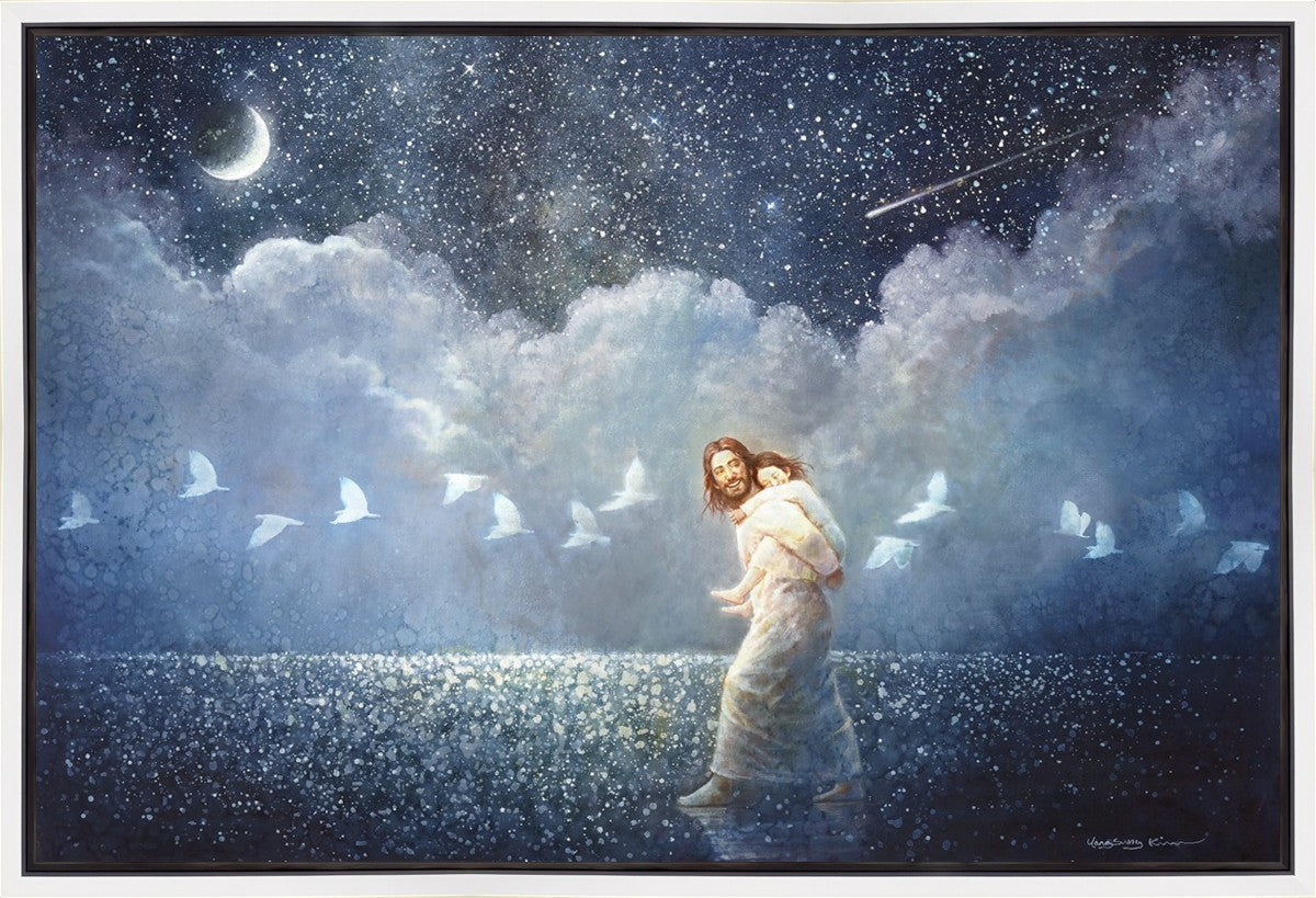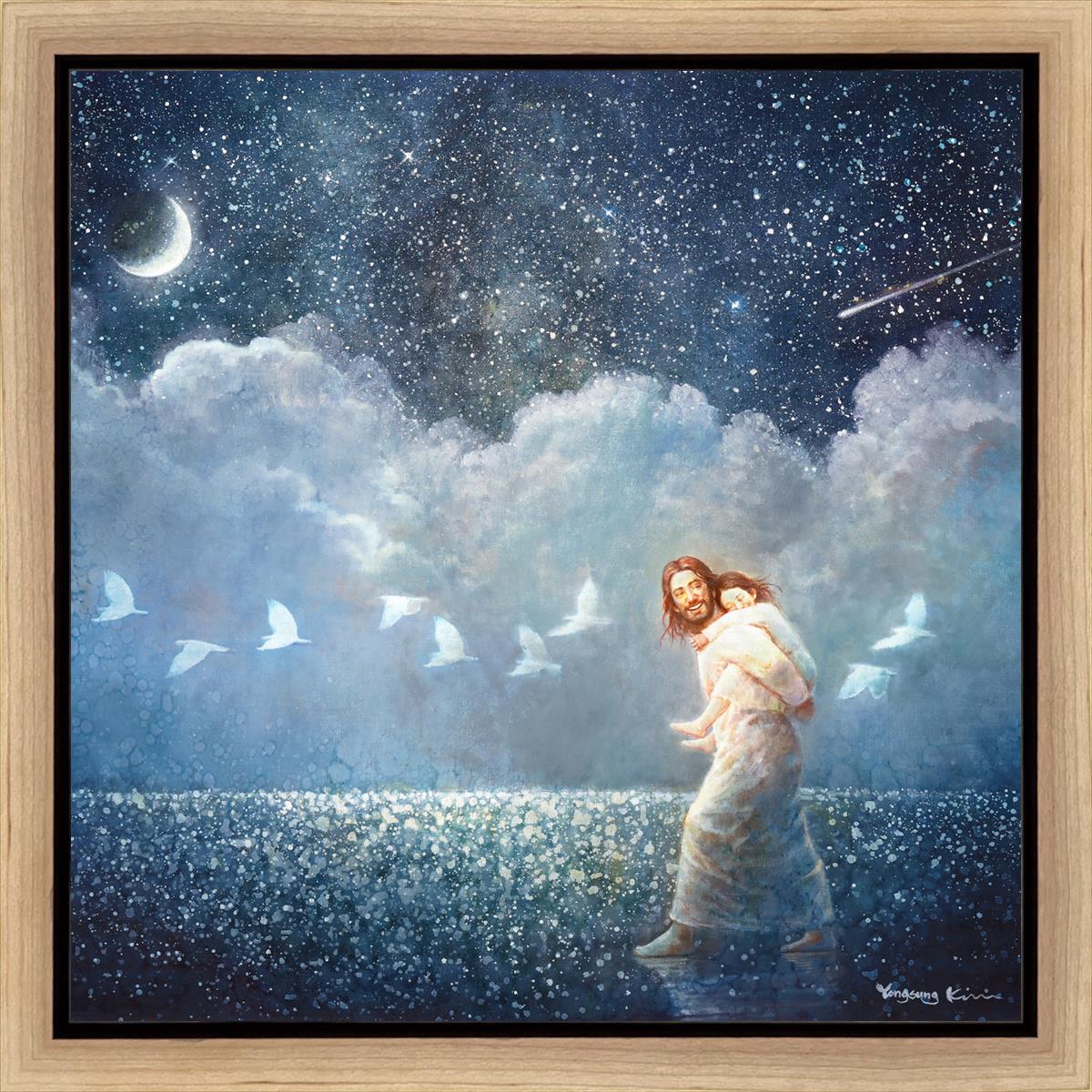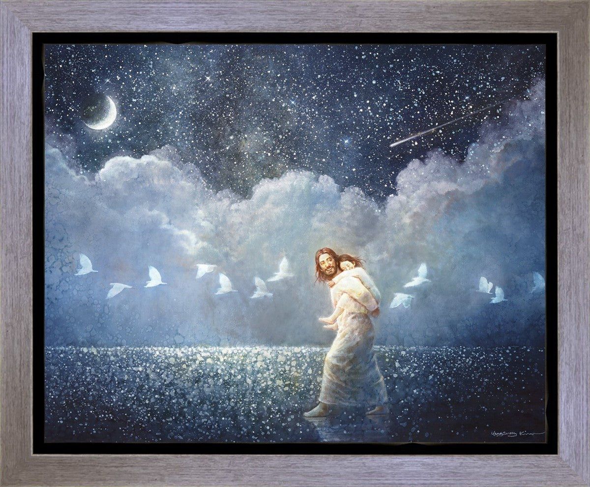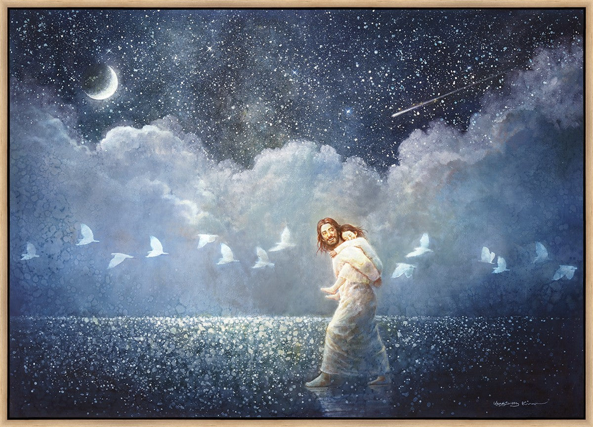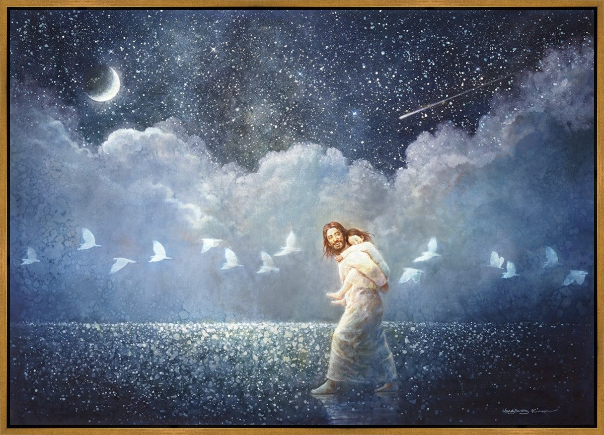 "With All Thy Heart" by Yongsung Kim is a captivating painting featuring Jesus Christ carrying a young girl over water in a dreamlike landscape. This masterpiece showcases celestial elements like the moon, stars, and a comet in the background. Perfect for art enthusiasts seeking spiritual inspiration and tranquility. Purchase this stunning artwork to adorn your space with timeless beauty and divine symbolism. Ideal for home decor, religious spaces, or as a thoughtful gift for loved ones.