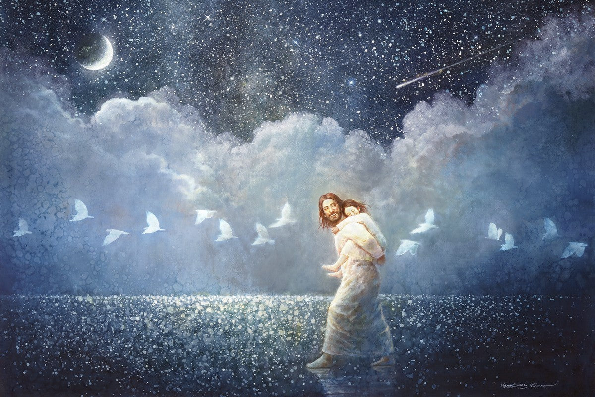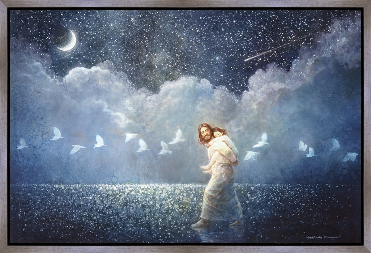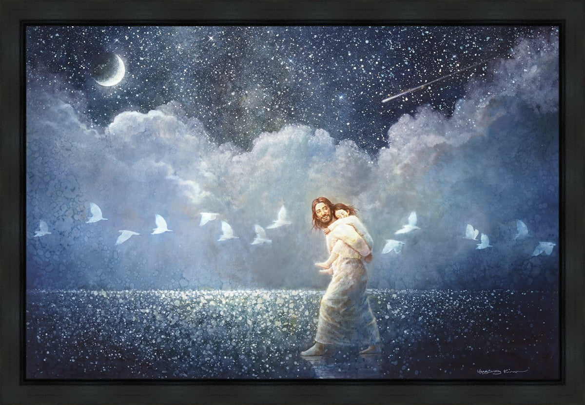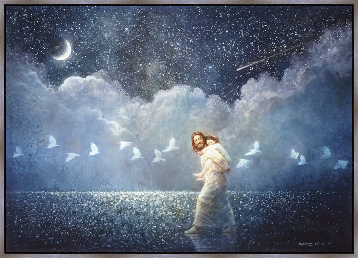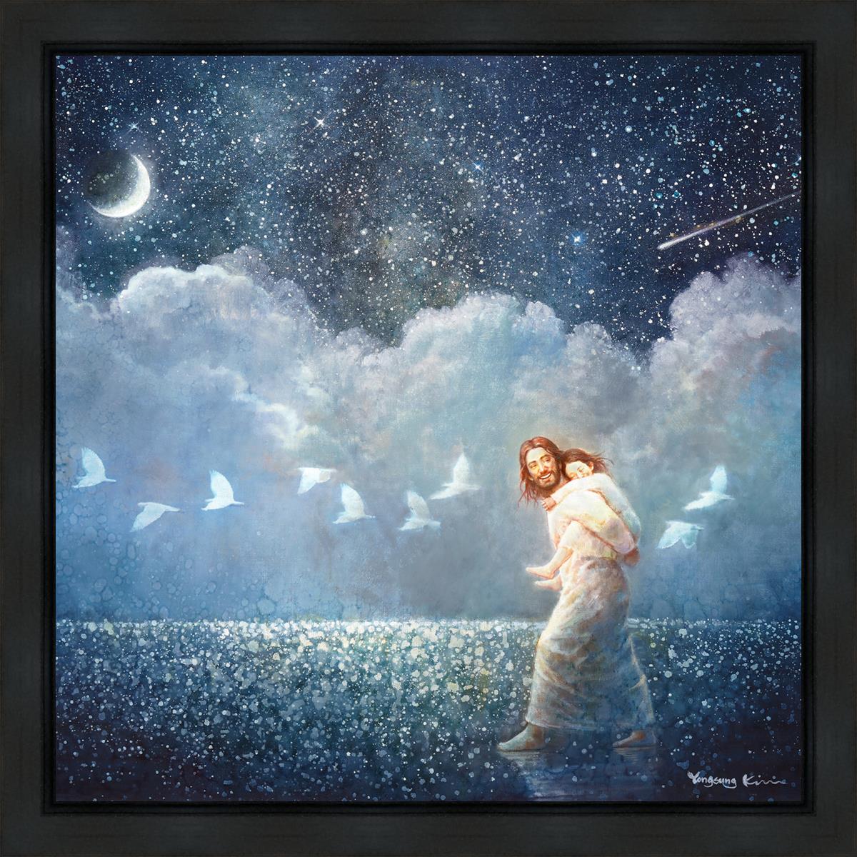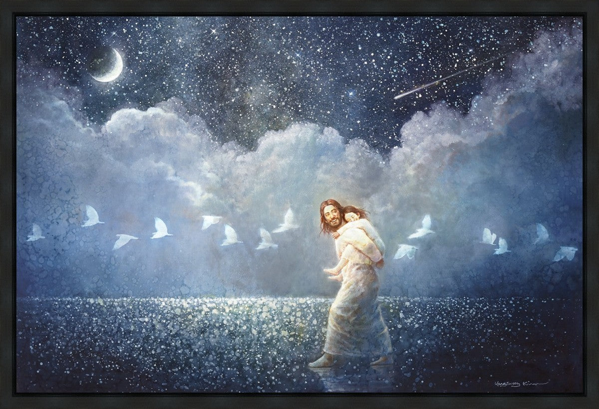 "With All Thy Heart" by Yongsung Kim is a captivating painting featuring Jesus Christ carrying a young girl over water in a dreamlike landscape. This masterpiece showcases celestial elements like the moon, stars, and a comet in the background. Perfect for art enthusiasts seeking spiritual inspiration and tranquility. Purchase this stunning artwork to adorn your space with timeless beauty and divine symbolism. Ideal for home decor, religious spaces, or as a thoughtful gift for loved ones.