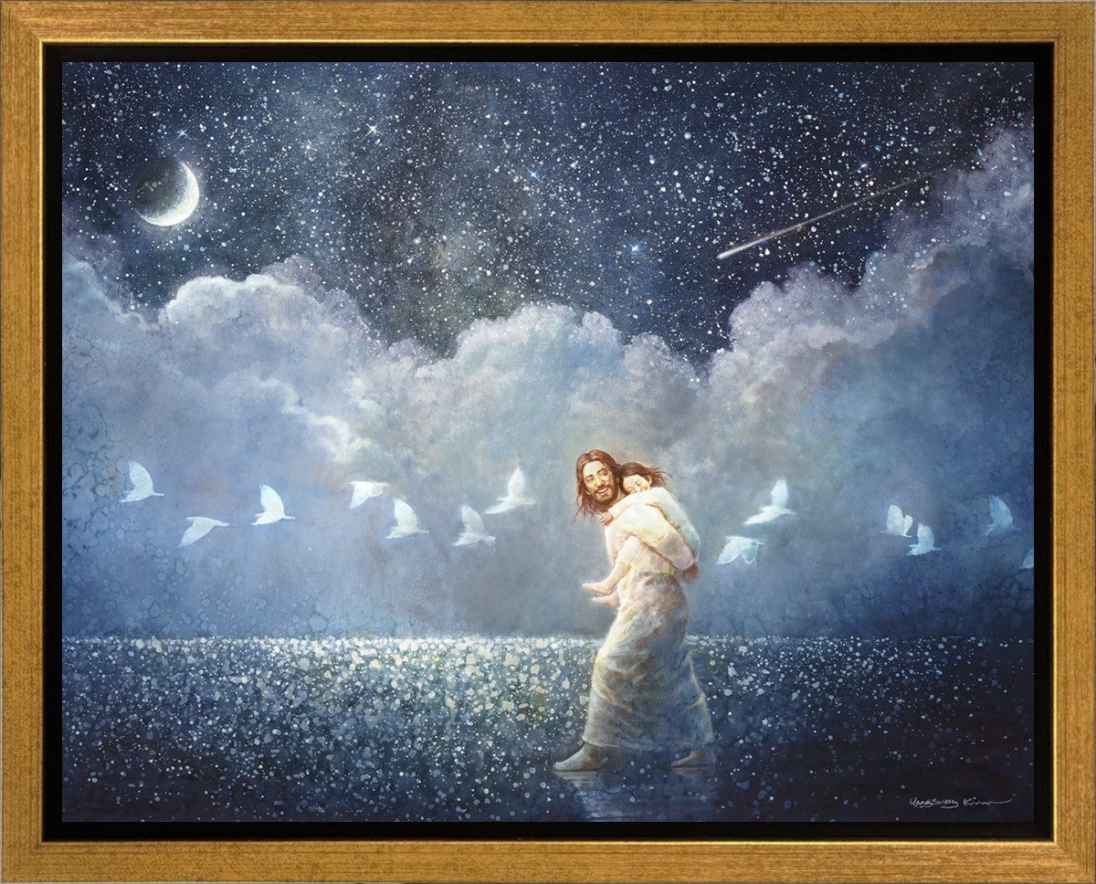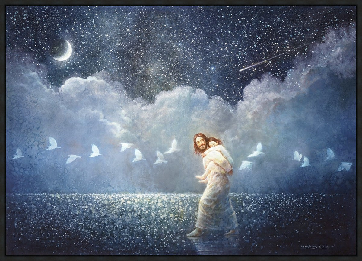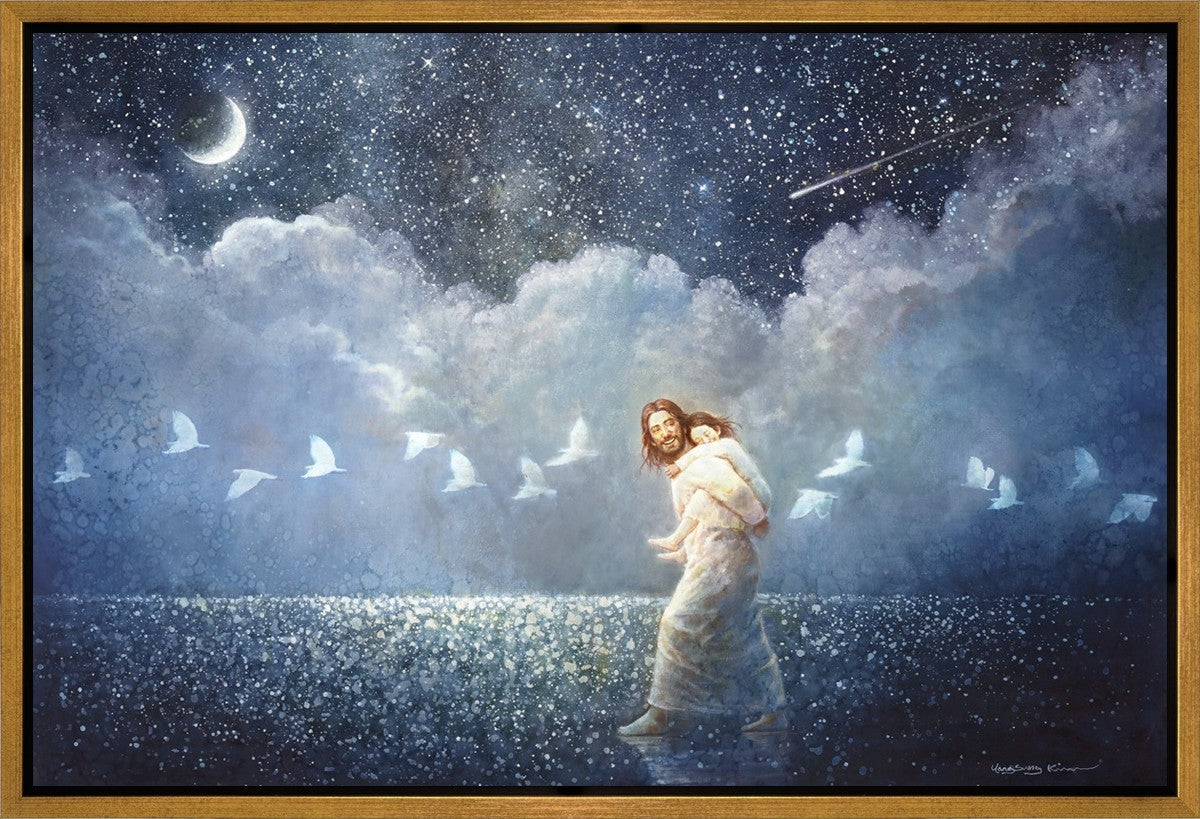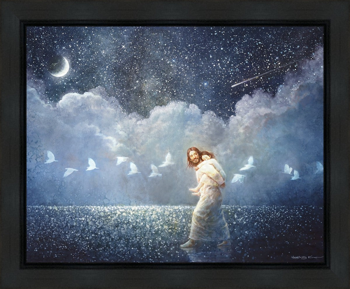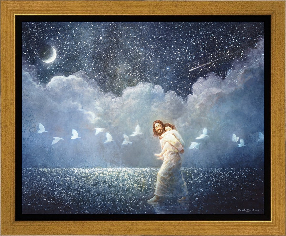 "With All Thy Heart" by Yongsung Kim is a captivating painting featuring Jesus Christ carrying a young girl over water in a dreamlike landscape. This masterpiece showcases celestial elements like the moon, stars, and a comet in the background. Perfect for art enthusiasts seeking spiritual inspiration and tranquility. Purchase this stunning artwork to adorn your space with timeless beauty and divine symbolism. Ideal for home decor, religious spaces, or as a thoughtful gift for loved ones.
