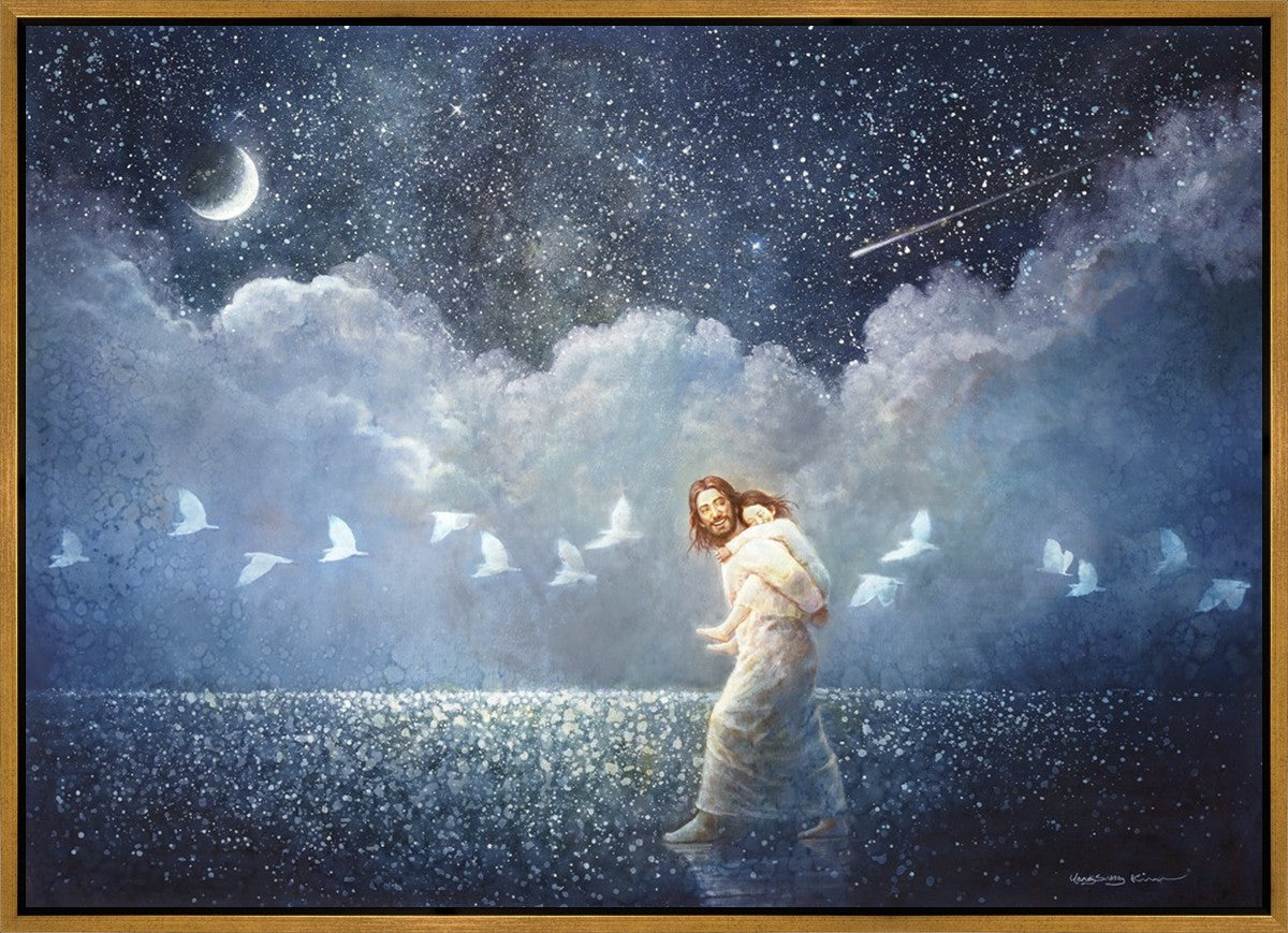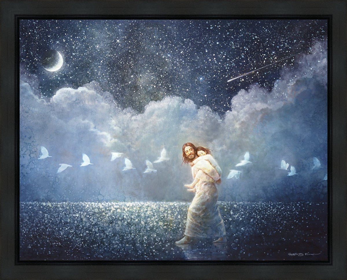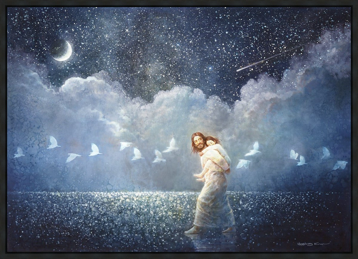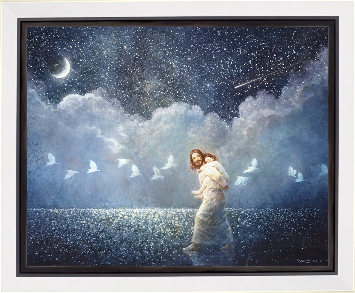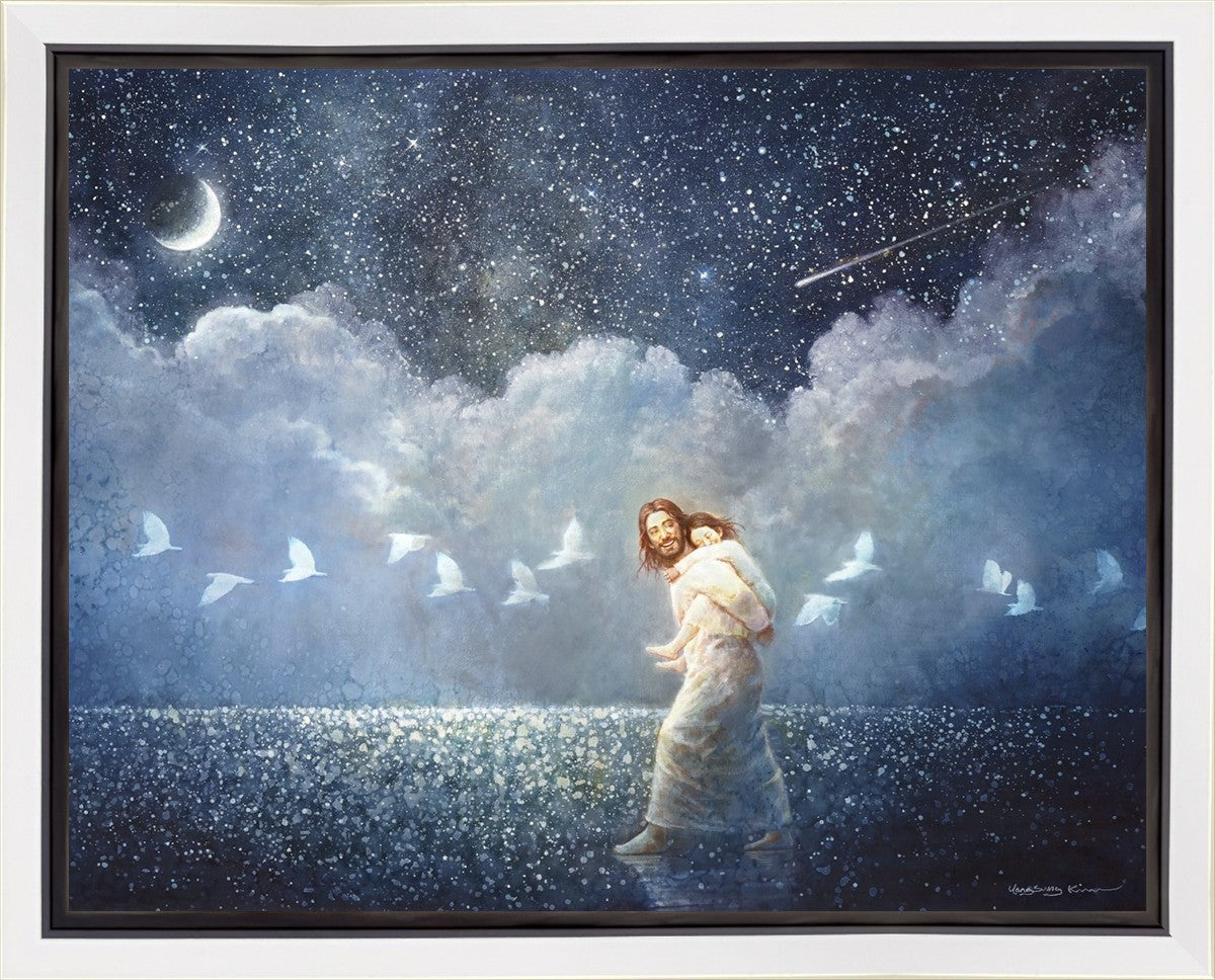 "With All Thy Heart" by Yongsung Kim is a captivating painting featuring Jesus Christ carrying a young girl over water in a dreamlike landscape. This masterpiece showcases celestial elements like the moon, stars, and a comet in the background. Perfect for art enthusiasts seeking spiritual inspiration and tranquility. Purchase this stunning artwork to adorn your space with timeless beauty and divine symbolism. Ideal for home decor, religious spaces, or as a thoughtful gift for loved ones.